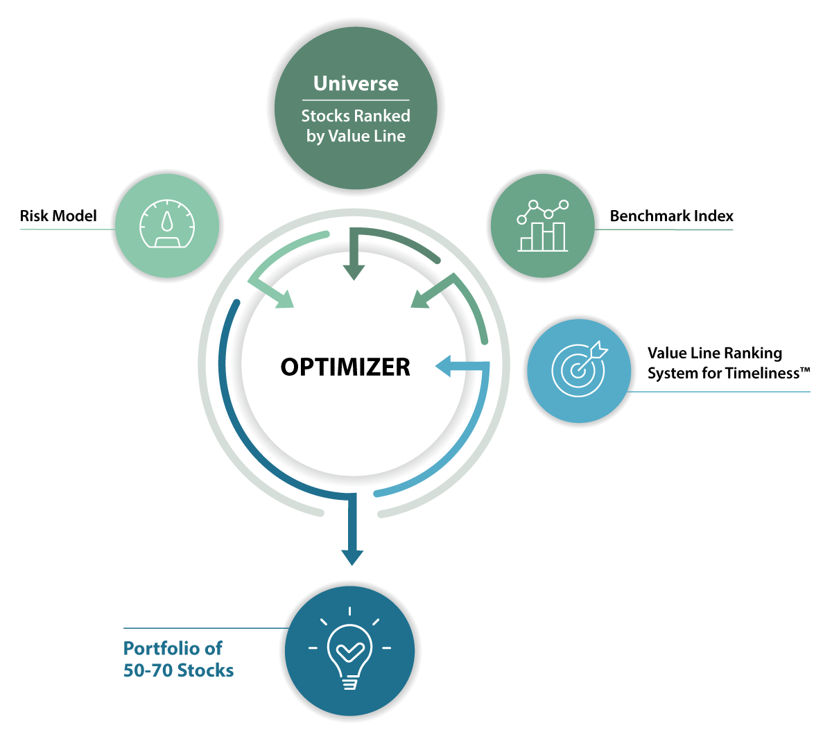 Stocks in the Value Line Ranking System for Timeliness™ system are optimized against each SMA’s strategy benchmark index for possible inclusion in the portfolio. The optimization process selects stocks and determines their relative portfolio weighting, balancing risk and reward, as projected by the Value Line Ranking System for Timeliness™.